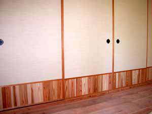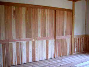 | 1F居間 床は杉板張り、腰張りも杉板! 建具も杉張りの板戸(引戸)です。 隣(表側の部屋)は和室のため、簡素な戸襖(杉の腰張り)にしました。 |