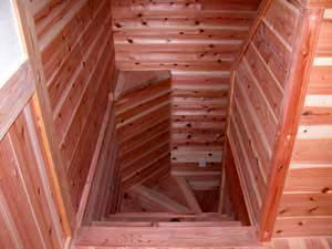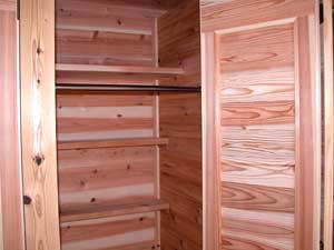 | 施主様のご意向でクローゼット及び物入れや押入の中も全て杉板(源平)を張りました。 周りの環境も最高!かなり環境に配慮したお宅となりました。心配なのは・・・(強いて言うなら) あっちもこっちも家中杉ばっかり!!いつか杉に飽きてこないか??? ということでしょうか? |