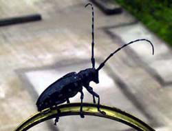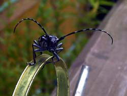 最近工場のまわりで一番よく見かけるカミキリムシです。 真っ黒なからだに白い水玉模様、ゴマダラカミキリです。 木の皮や葉っぱを食べます。