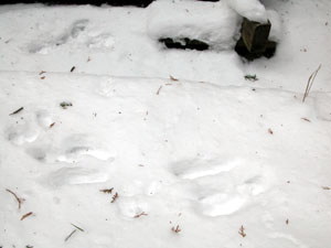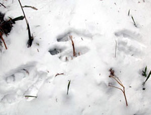 工場裏から裏山に続く山道にずっと足跡が残っていました。 両足がきれいに揃っています。大きさは長さ10cmくらい。 野ウサギかな? と思ったのですが・・・(?_?) 戻る Home
