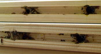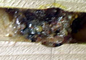クローゼット框(加工済み)が置いてあった所 框の溝(ダボ穴に集中)に黄色い汁と怪しい固まりが・・・?(カチカチで簡単に取れない) 頻繁に蜂が飛んでいるのは見かけていたのですが、これはいったい何なのでしょうか?