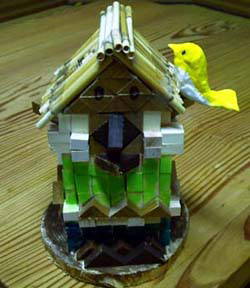 2000. 8.31 (カン太+α) 夏休み最後の日 郵便局に出す貯金箱を作りました。 組子の端っことフェンスの端っこと、葦の切れ端を木工用ボンドでくっつけただけ。 「しゃあないから作ったぞ!!」作品です。