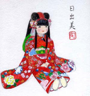 2002年10月14日 ひいちゃん(15歳)の作品 8月に描いた市松人形を座らせてみました。 生きているような・・・? 動きのある絵になりました。