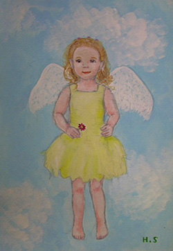 2001年11月3日 ひい(14歳)の作品 中学校の文化祭に出した絵の一枚です。 本人はあまり気に入っていなかったようですが・・・ 私はこの天使の瞳と白い羽根が気に入っています。