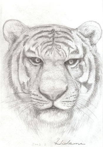 2002年2月18日 ひいちゃん(中2) 臨時で来て下さっていた先生へのプレゼント用に描いた作品です。 前回のトラ(カラー)は優しい目をした雌の" とら " 今回描いたトラは、目つきの鋭い雄の" 虎 " です。