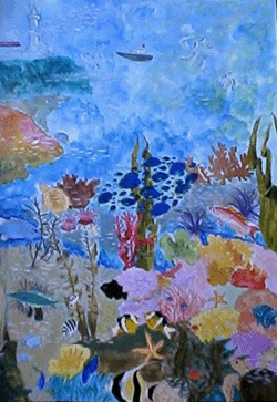 お魚になって、海の中から灯台を見たらどんな感じかな? と想像で描きました。 大王町主催〈第3回〉海と灯台のある風景画コンクールに応募した作品です。 結果は・・・”佳作入選” 賞状より先に 副賞の大王町特産品(新鮮な魚の干物)が届き、家族で大喜びしました。