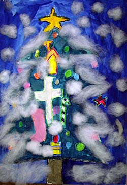 カンちゃん(5歳)の作品(四切り画紙) 「出来上がったら雪をいーっぱいつけてみよっか」 っと言ったら さっさと描きあげて、嬉しそうに綿をいっぱい貼りました。 「今年はクリスマスツリーいらないね」 そう言って台所にしばらく貼ってあった作品です。