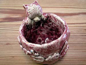 6年生 学年自主活動にて マイカップ と 鉛筆立て (カン太の作品) 湯飲み茶碗 (カン母の作品) ネコ好きの二女の湯飲みがひび割れたままだったので娘用に作りました。 ものすごく使い勝手が悪そう・・・ ネコの憎らしげな表情とお尻が可愛く出来ました。(^_^;;