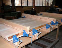 左の画像は桧テーブルの天板(3枚)を接ぎ合わせているところです。 木工用ボンドを接着面に付け金物(ハタガネ)でギュッと圧縮、しっかり接着させます。 (一昼夜くらい) テーブルの端になるところは、木の肌を そのまま残しています。 (お客さまの好みに応じて・・・) 2002.12. 7 |
