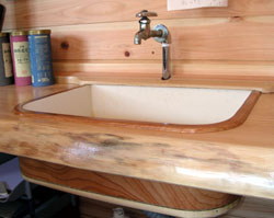 ログハウス用、簡易シンク (すみれ工房内のシンクに続いて、第2作目の 試作品、少し自信がないので知人からの 依頼のみ制作しています。)(^_^;; シンク本体はケヤキ材、内側はデコラ張り ワークトップ(天板部分)は桧の一枚板。 今のところ水漏れはありません。 2003. 4. 5 |