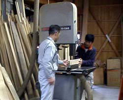 | 木取りとは主に帯ノコ(大きい鋸で巾の広い 材木を挽く機械)やリッパー、昇降板などで 材木を大まかな建具の大きさに切断し 部材を作っていく作業です。 一見、簡単な作業のように見えますが、 「木を生かすも殺すも木取り次第」と言うくらい 木を扱う者にとっては大切な仕事です。 人間に性格があるように、木にもそれぞれ 育った環境などによって性格があります。 それを見抜き一番適したところに使う。 長年の経験とカンがないと出来ない仕事です 2002. 3.24 |