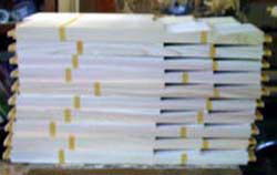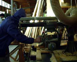 ↑ 桧材 鎧(よろい)の制作過程 ← テープで束ねた部材をラジアルソーでカットして、後 鉋で仕上げます。大工さんからの注文です。2002. 4.10 |