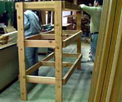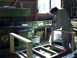 | 仕事が無くなるたびに 工場のあちこちに整理棚が増えていきます。 今日は、フラッシュの芯材や集成框等々を 片づける棚を作りました。 図面もキッチリした寸法も無し。気の向くまま とても使えそうにない節だらけの材木で 適当にパンパンパン!っとこしらえます。 いい加減なものですが・・・使い勝手は バッチリでした。(^_^)v 2002. 春の画像です。→ |