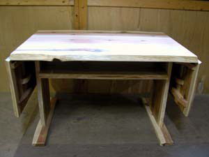 杉材テーブル(折り畳み式) 材質 : 杉材(小節あり) 水性ウレタン塗装 サイズ 巾 1140mm 奥行き 770mm 天板厚み 35mm 両サイドを広げると10人掛用(巾は↑1940mm)になります。 下に棚が付いています。 1台¥80,000円〜 (消費税込) ご希望のサイズ・デザイン等をご連絡(FAX または E-mailにて)ください。 御見積させていただきます。