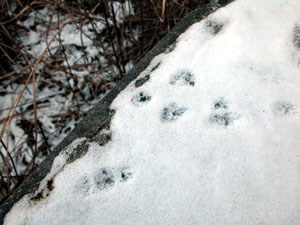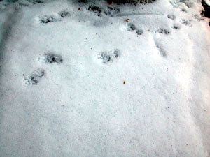 工場裏から裏山に続く山道にずっと足跡が残っていました。 両足がきれいに揃っています。大きさは長さ10cmくらい。 野ウサギかな? と思ったのですが・・・(?_?) 戻る Home