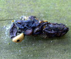 チューリップのまわりにポツン・ポツン・・・いったい誰のフン? ↑ 手すりの上(長さ2cm 直径5mm くらい) 中には木の実の種のようなものがそのまま残っています。 屋根の上に干からびた糞↑をたくさん見つけました。 ↑ 翌朝 チューリップの横に落ちていた糞 おなかをこわしていたようです。 糞図鑑があれば良いのになぁ・・・(-___-;; もし小動物の糞にお詳しい方がみえましたら是非ご連絡下さい。