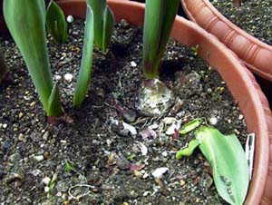 またまたチューリップが食べられました。 葉が伸びてもうすぐ蕾がふくらんできそうだったのに・・・(:_;) ちょっとした隙に(ほとんど夜間)に食べられてしまいました。 いたち それとも リスのしわざ? きっと山に食べるものが無くなったのでしょうね。 だんだんチューリップより おなかを空かせたイタチ?のほうがかわいそうになってきました。