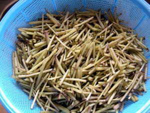 | 山ぶきは葉っぱを取り、洗ってしばらく水に浸けます。 サッと塩ゆでにし、ザルにとってまた水に浸けアク抜きをします。(一晩くらい) 佃煮用に適当な長さに切ります。 |