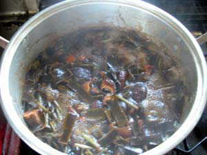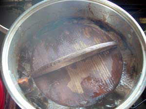 | 大鍋に下ごしらえした食材と調味料を入れだし汁を加えます。(ひたひた程度) とろ火で煮ること一昼夜以上、気長にコトコト・・・汁気がなくなって照りが出てくる まで煮込みます。(我が家では、おばあちゃんの仕事です。) |