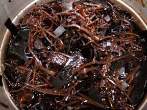 | 煮詰まったら最後にもう一度醤油とみりんで味を整え、火から下ろして出来上がり! きれいな大瓶に詰めて冷蔵庫へ・・・常備菜として1年以上保存できますよ。(^_^)v |