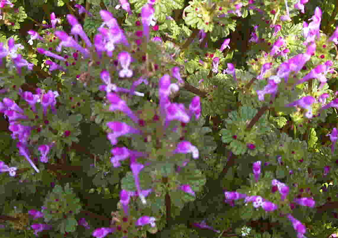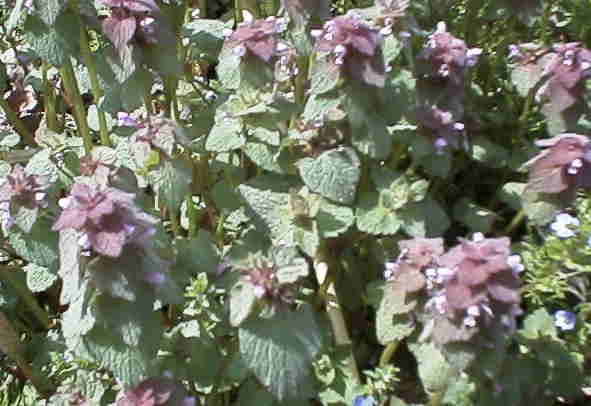 シソ科・2年草 2枚の葉が茎をとりまくようにつく形 が仏像の蓮華座に見えることから ついた名前 |