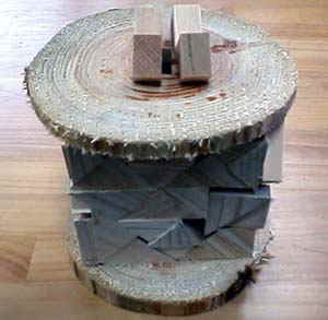 ↓丸太の輪切りと三角端材を使った貯金箱(色を付けたら完成です)
