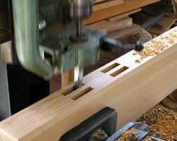 | 久しぶりにまともな仕事、門の戸の仕事が 入って来ました。 材質は台桧(台湾桧)、もうかれこれ15年以上も工場で眠っていた大切な木です。 右の画像は大きな框(かまち)=(建具の左右 になる枠) に油圧角のみ(穴をあける機械)で上桟 下桟のほぞを填め込む穴をあけているところです。 2003. 2.21 |