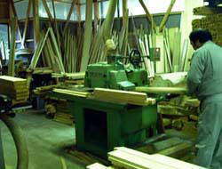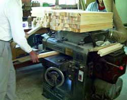 | プレナーで桧材の片面を削る作業です。 この機械はすみれ工房の機械類の中では もっとも古い機械の中の1つです。 1人でも出来る作業ですが、ほとんど2人で 削ることが多いです。 2002. 4. 8 |