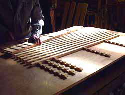 | 防寒(一番外側に入れる寒さ避けの建具) の外にはめ込む格子枠の組立風景です。 格子の組み方は簡単なものから、高度な 技術が要るものまで色々とありますが、 工務店さんや施主様との打ち合わせや 材質及び価格によって多少変わります。 画像の格子は一番簡単な組み方です。 2002. 3.31 |
