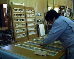 ↑ 桧材 鎧(よろい)の制作過程 ← テープで束ねた部材をラジアルソーでカットして、後 鉋で仕上げます。大工さんからの注文です。2002. 4.10 |