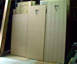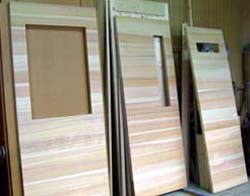 | ← フラッシュ 制作の様子です。 フラッシュとは、 普通の障子や硝子戸、無垢材ドアとは違い 建具の寸法に作った木枠に両面ベニヤ板や 化粧合板、突き板や杉や桧の単板などを 張って作るドアや引き戸のことです。 手間はかかりますが、価格は無垢材の建具に 比べると若干安いです。画像は硝子の部分を 抜いた後に桧の枠を入れているところです。 2002. 4.28 |