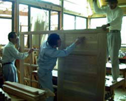 | シオジ(関東ではタモ)無垢材硝子戸(特大) 組立の様子です。 楢材やシオジ材は、桧や杉材と比べると とても硬く作業にはとても力がかかります。 (国産のシオジは比較的軟らかいです。) この硝子戸は3人がかりで組み立てました。 2002. 4.15 |