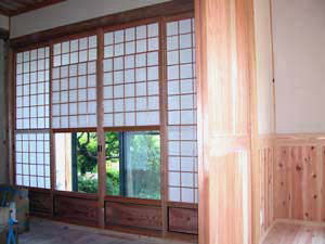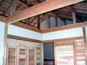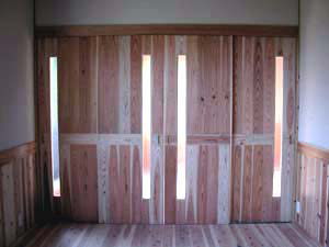 | 1F居間 床は杉板張り、腰張りも杉板! 建具も杉張りの板戸(引戸)です。 隣(表側の部屋)は和室のため、簡素な戸襖(杉の腰張り)にしました。 | ||