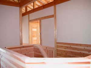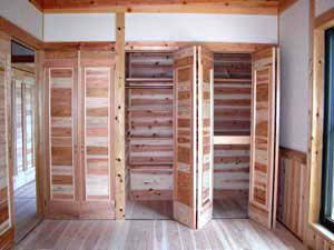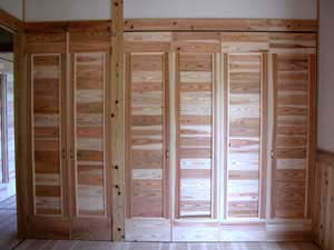| 施主様のご意向でクローゼット及び物入れや押入の中も全て杉板(源平)を張りました。 周りの環境も最高!かなり環境に配慮したお宅となりました。心配なのは・・・(強いて言うなら) あっちもこっちも家中杉ばっかり!!いつか杉に飽きてこないか??? ということでしょうか? | ||