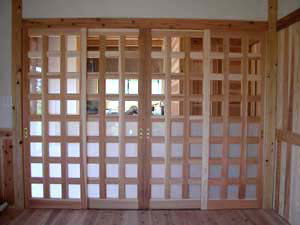 | 1F和室の雪見障子、唯一ごく普通の建具です。 | キッチンと居間 間仕切り硝子戸(杉材) | |