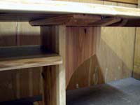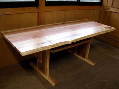 杉材テーブル(折り畳み式) 材質 : 杉材(小節あり) 水性ウレタン塗装 サイズ 巾 1140mm 奥行き 770mm 天板厚み 35mm 両サイドを広げると10人掛用(巾は↑1940mm)になります。 下に棚が付いています。 1台¥80,000円〜 (消費税込) ご希望のサイズ・デザイン等をご連絡(FAX または E-mailにて)ください。 御見積させていただきます。