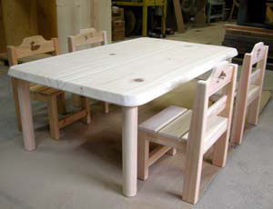 幼児用 机と椅子 材質 : 桧(ひのき)材 無塗装 参考画像↑机のサイズ 1200 × 700 高さ : 450 天板 : 2枚接ぎ 足:取り外し可 (塗装は希望のある場合のみ) 机1台 ¥60,000円 〜 (送料別途) 椅子1脚 \6,000円〜 (送料別途) ご希望のサイズ・デザイン等をご連絡(FAX または E-mailにて)ください。 御見積させていただきます。
